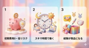 ここで重要なのは、「家でできる」だけでは弱いということです。主婦にとって本当に強いのは、保育園のお迎え前、昼寝中、夜1時間のような細切れ時間でも回しやすいことです。